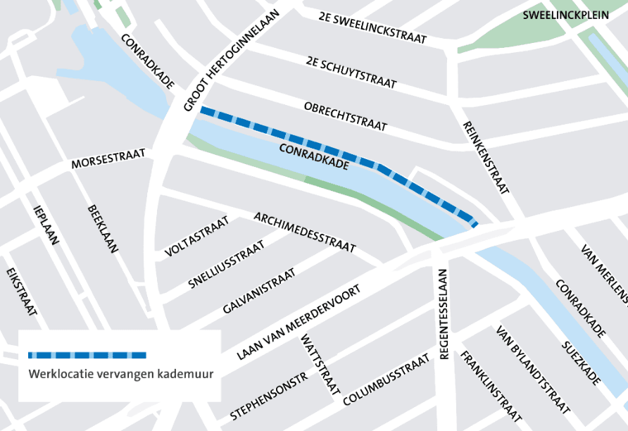 Langs de Conradkade, tussen de Groot Hertoginnelaan en de Laan van Meerdervoort, vervangen we ruim 400 meter kade. De bestaande constructie bestaat uit een verankerde houten damwand met steenglooiing, waarvan de levensduur is verstreken. Daarom realiseren we een volledig nieuwe kadeconstructie met een stalen damwand en verankering, inclusief een complete herinrichting van het talud, groen, trapjes en het voetpad.